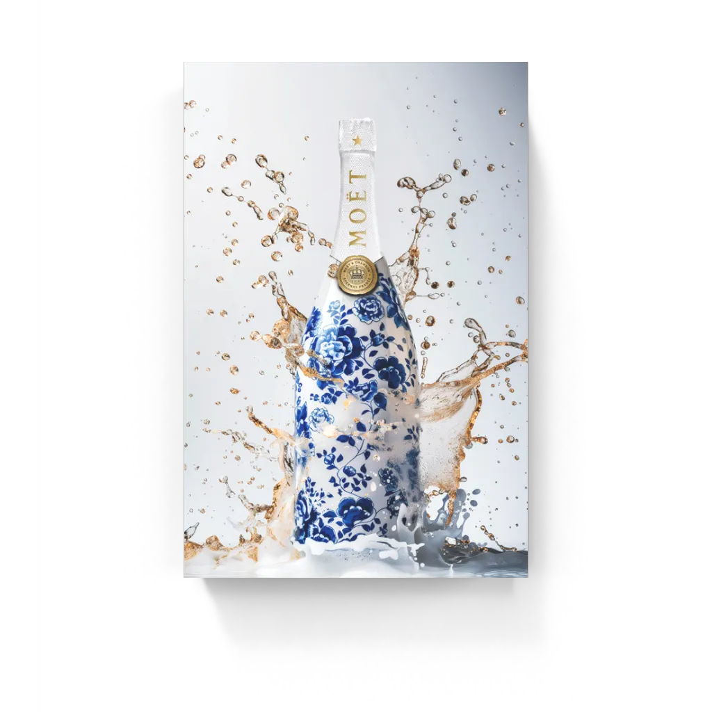 Pop de kurk, maar dan in stijl.Ons Champagne Delftsblauw schilderij vangt de luxe van een iconisch champagnemerk...