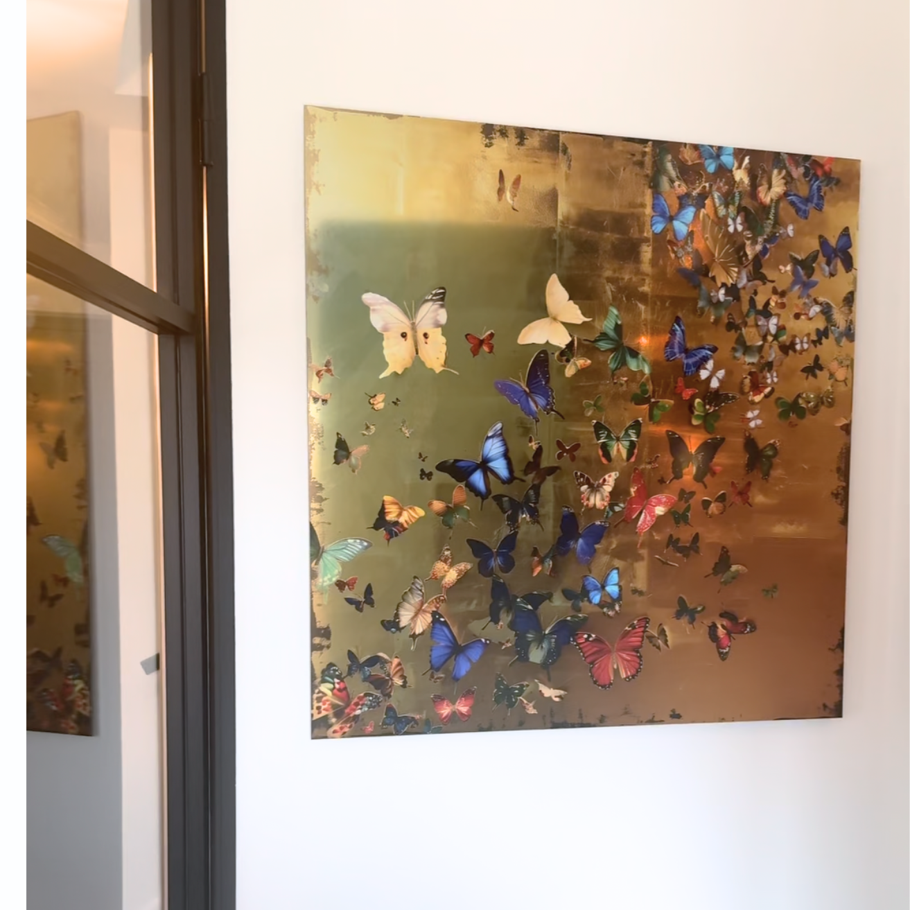 De rijkdom van het met goud bewerkte oppervlak contrasteert prachtig met de levendige vlinders in diepblauw, smaragdgroen en karmijnrood. Elke print wordt vervaardigd met een speciale hoogglans-afwerking die de kleuren laat oplichten en het kunstwerk van elke hoek een andere uitstraling geeft.