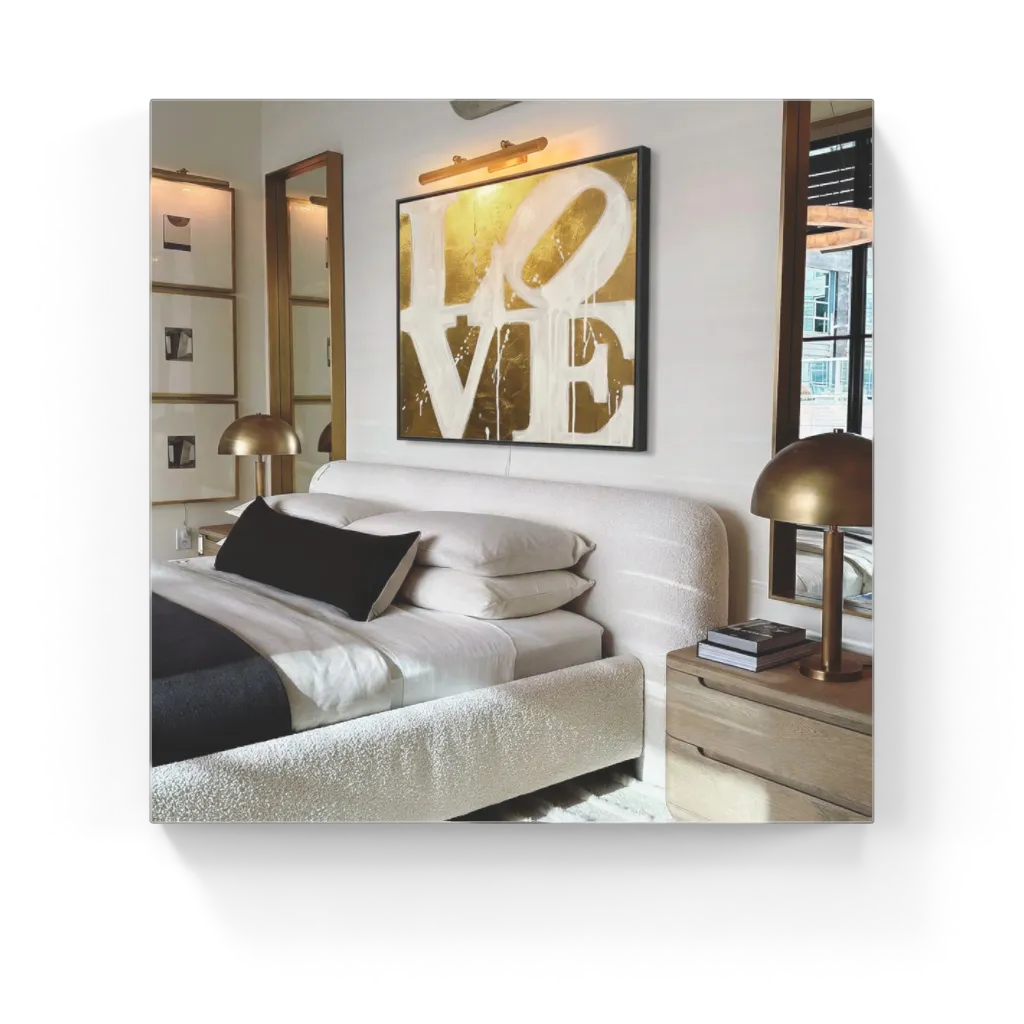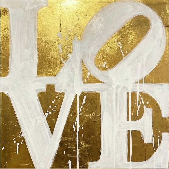 Modern love schilderij met grote witte letters op goudkleurige achtergrond