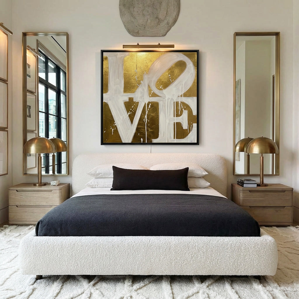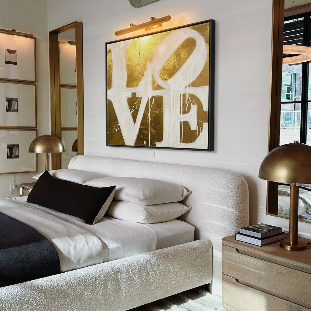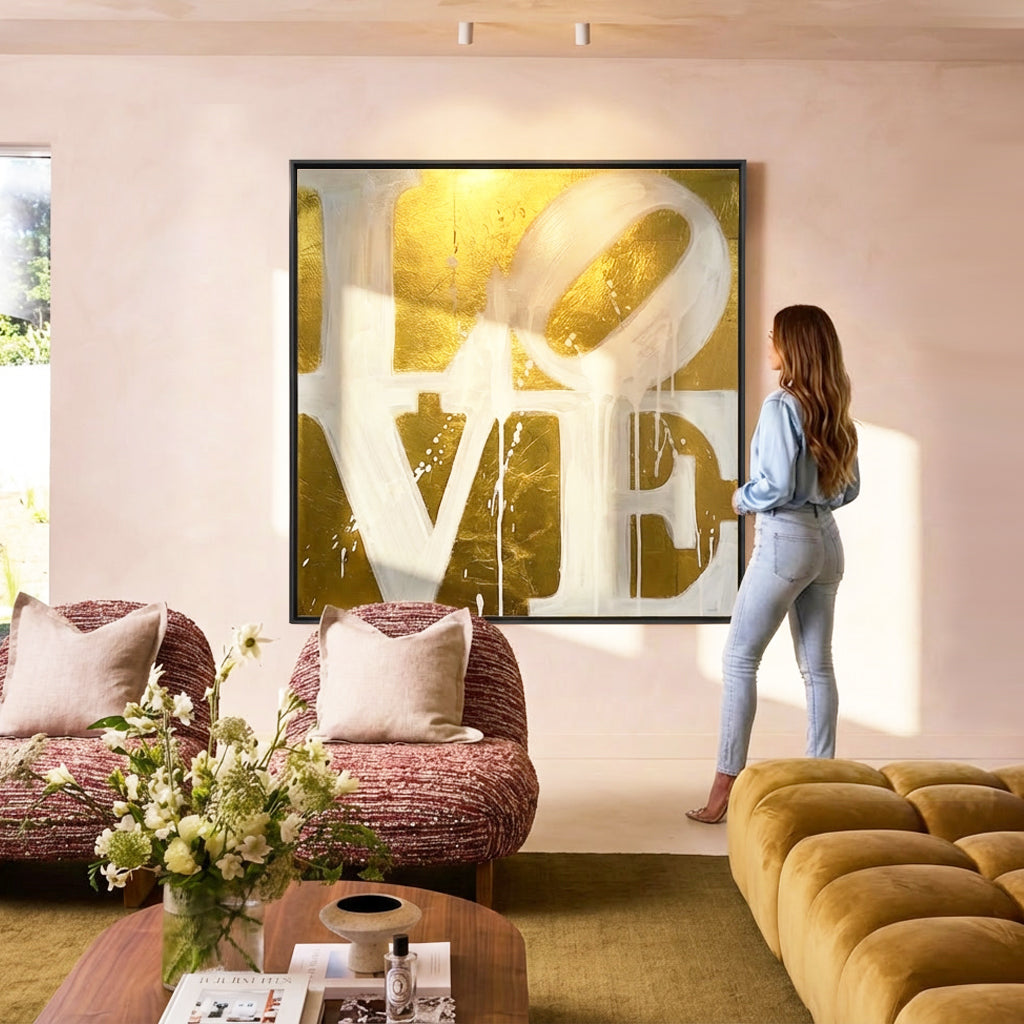 Luxe LOVE wandkunst met expressieve typografie en gouden uitstraling