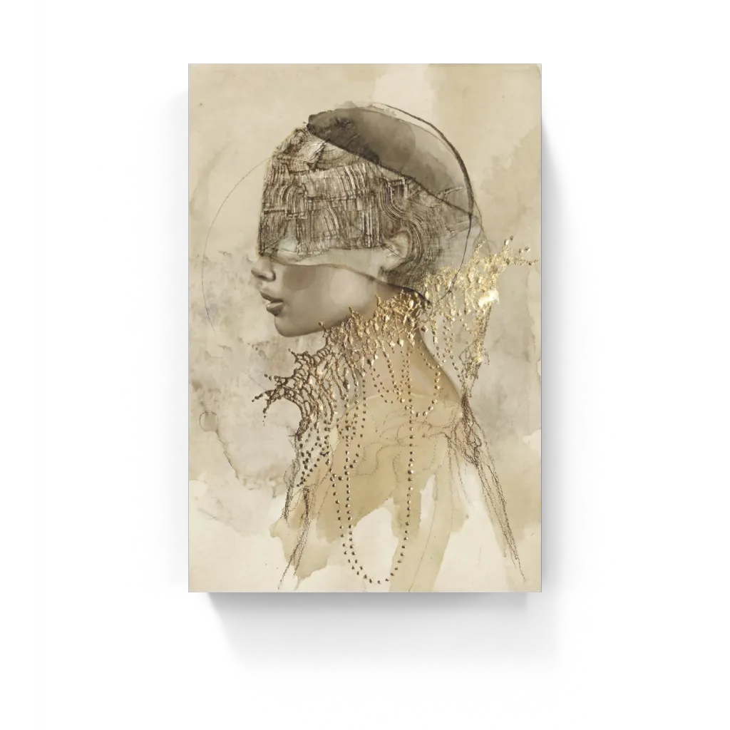 Kunstwerk van vrouwelijk profiel met gelaagde texturen en subtiele goudaccenten