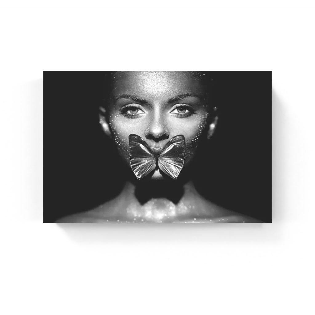 Een prachtige zwart wit print van een vrouw met een vlinder op haar mond. Het is een...