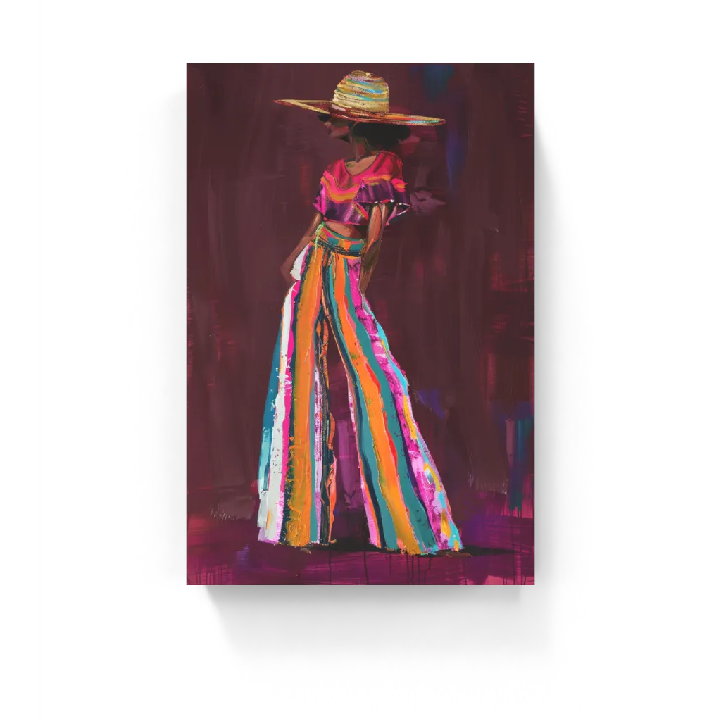 Abstract schilderij van een elegante vrouw in kleurrijke kleding met hoed, vrouwelijke en moderne kunststijl