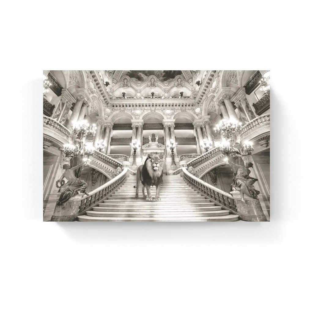 Een prachtige en krachtige leeuw, verdwaald in een klassieke hal van een oud gebouw. Dit zwart wit...