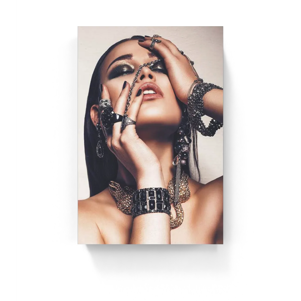 Een prachtig plexiglas schilderij met een mooie vrouw volledig verwikkeld in haar luxe sieraden. Met dit plexiglas...