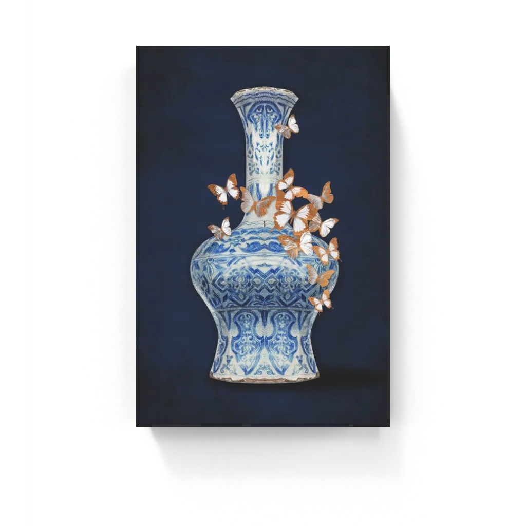 Een prachtig delfts blauwe vaas met bronskleurige vlinders weergegeven als modern stilleven, met heldere kleuren die jouw...