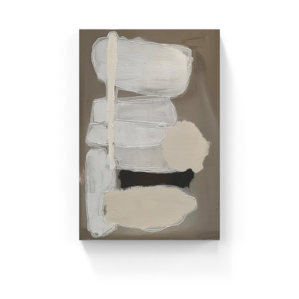 Modern abstract schilderij met neutrale kleuren en tactiele structuren, geïnspireerd door natuurlijke verwering en balans.