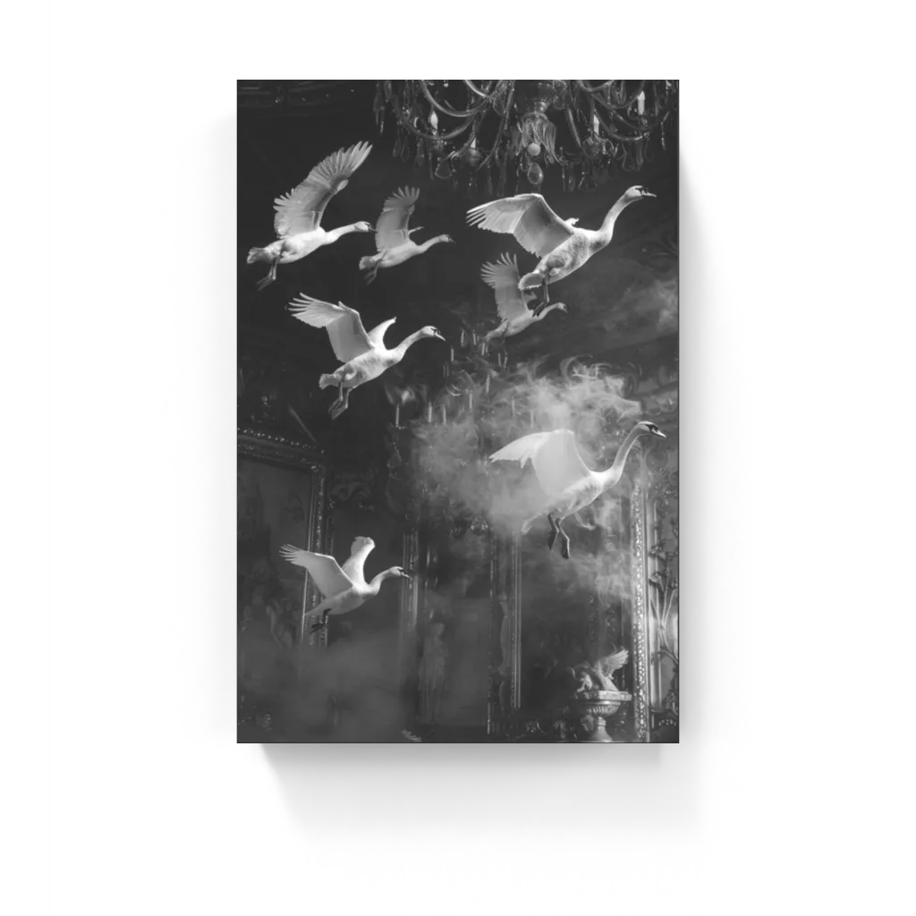 Symphony of Wings Een betoverend zwart-wit kunstwerk waarin majestueuze zwanen sierlijk door een barokke zaal zweven. De...