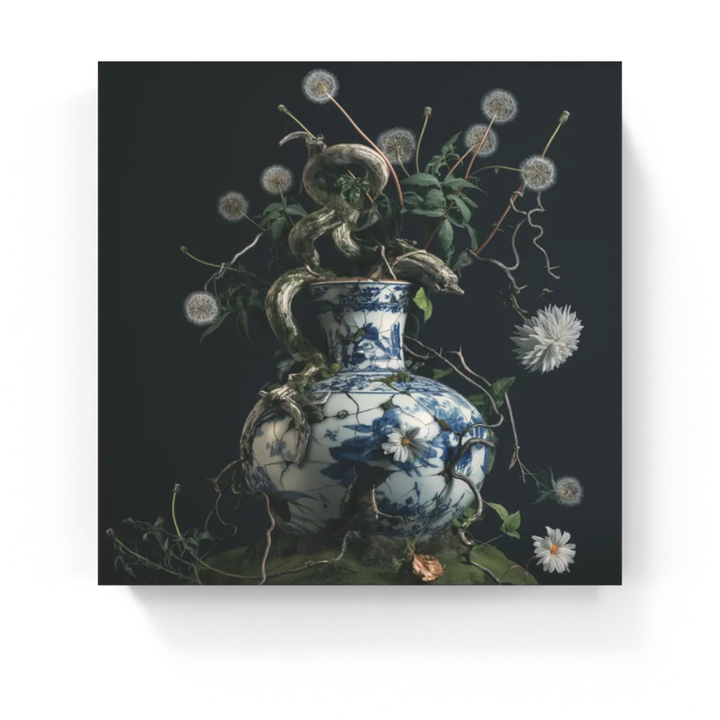 Broken Balance Een klassieke porseleinen vaas, zichtbaar beschadigd, overwoekerd door takken, bloemen en onkruid. Broken Balance laat...